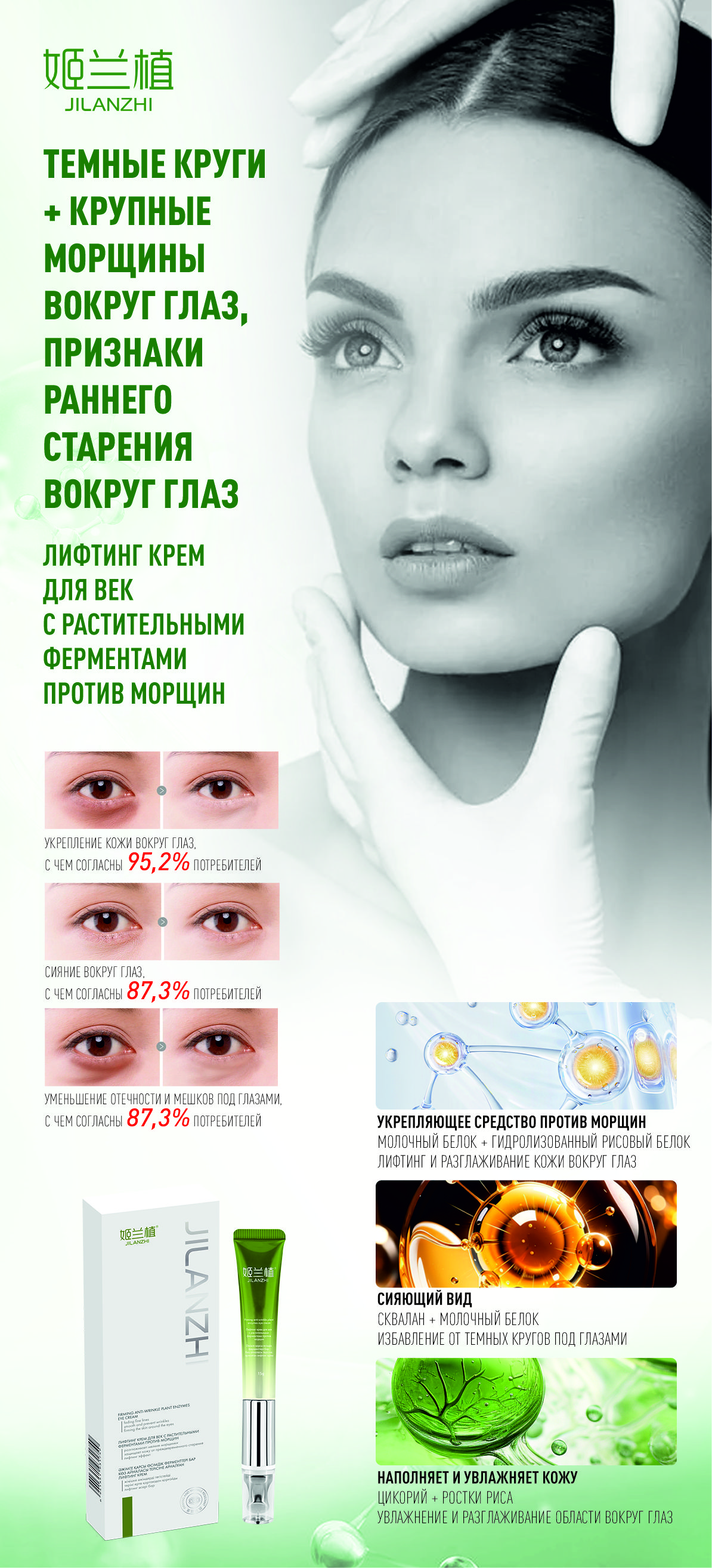 - 95,2% пользователей отметили *укрепление кожи* вокруг глаз